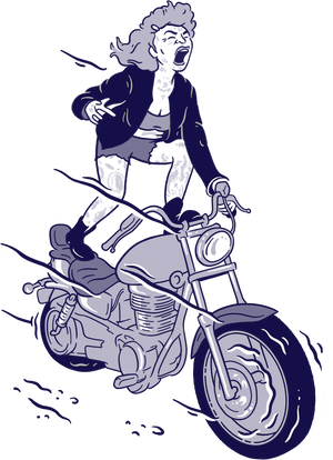 A world of contradictions, Betty's absolutely everywhere and nowhere all at once, ready to jump to the rescue but forgetting where she's put her fuckin' phone yet again. Betty spends her days out in the heat trying to avenge the lives of all the women she couldn't protect from harm. Moving and grooving at her own erratic pace, Screaming Betty hurtles down highways on her motorbike with her gang, The Vermentinos. She's constantly keeping one eye out for solo female travellers looking for respite from the humbug of male disgrace and another eye keenly for the next rural watering hole.